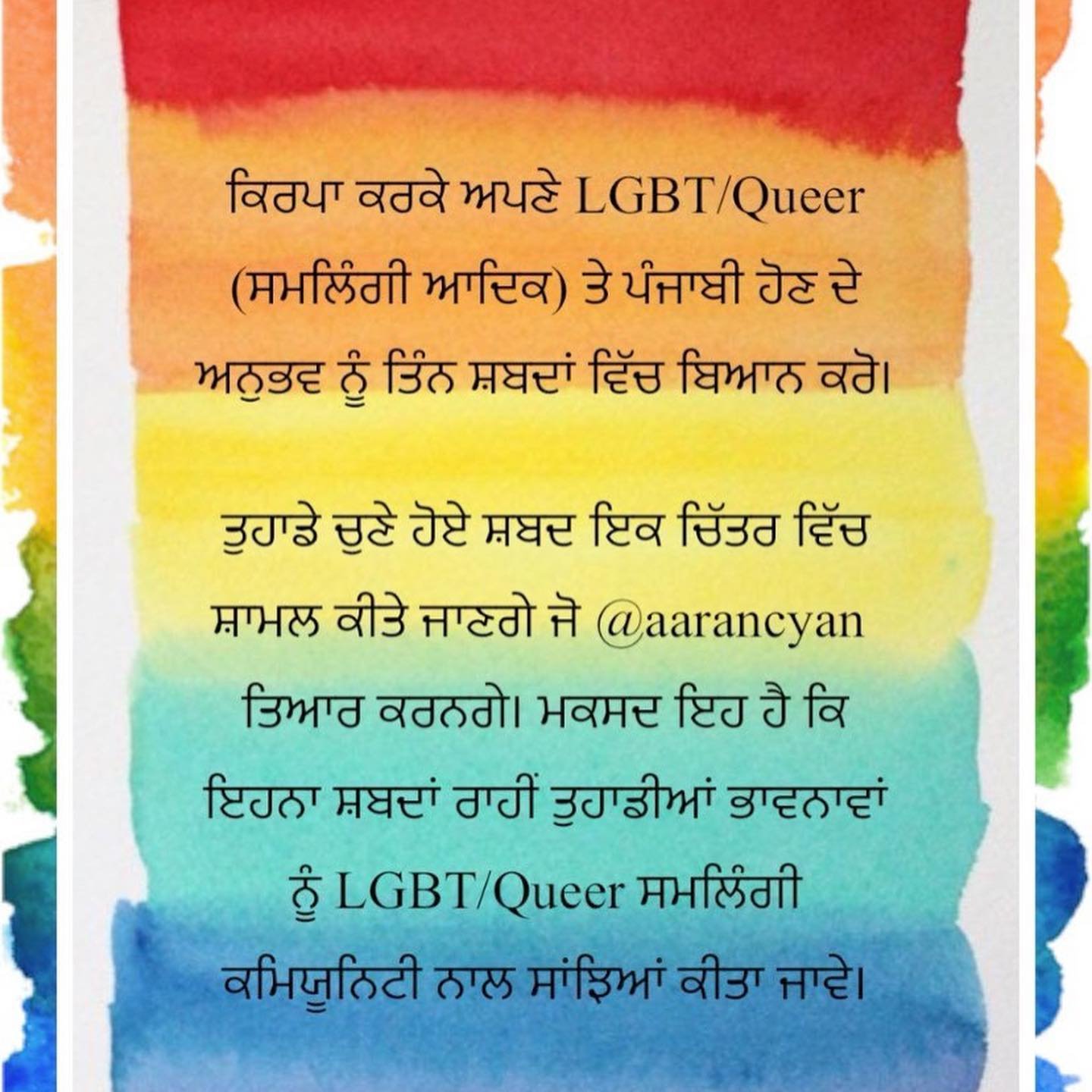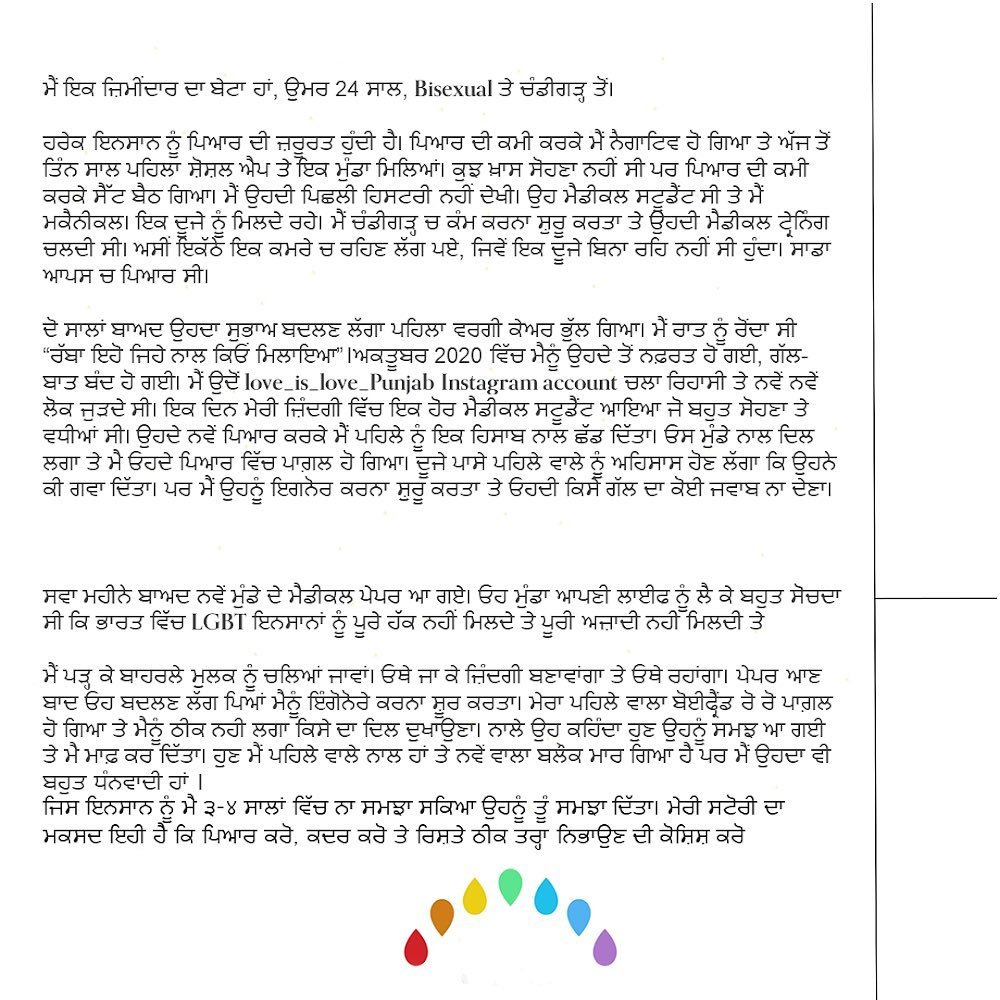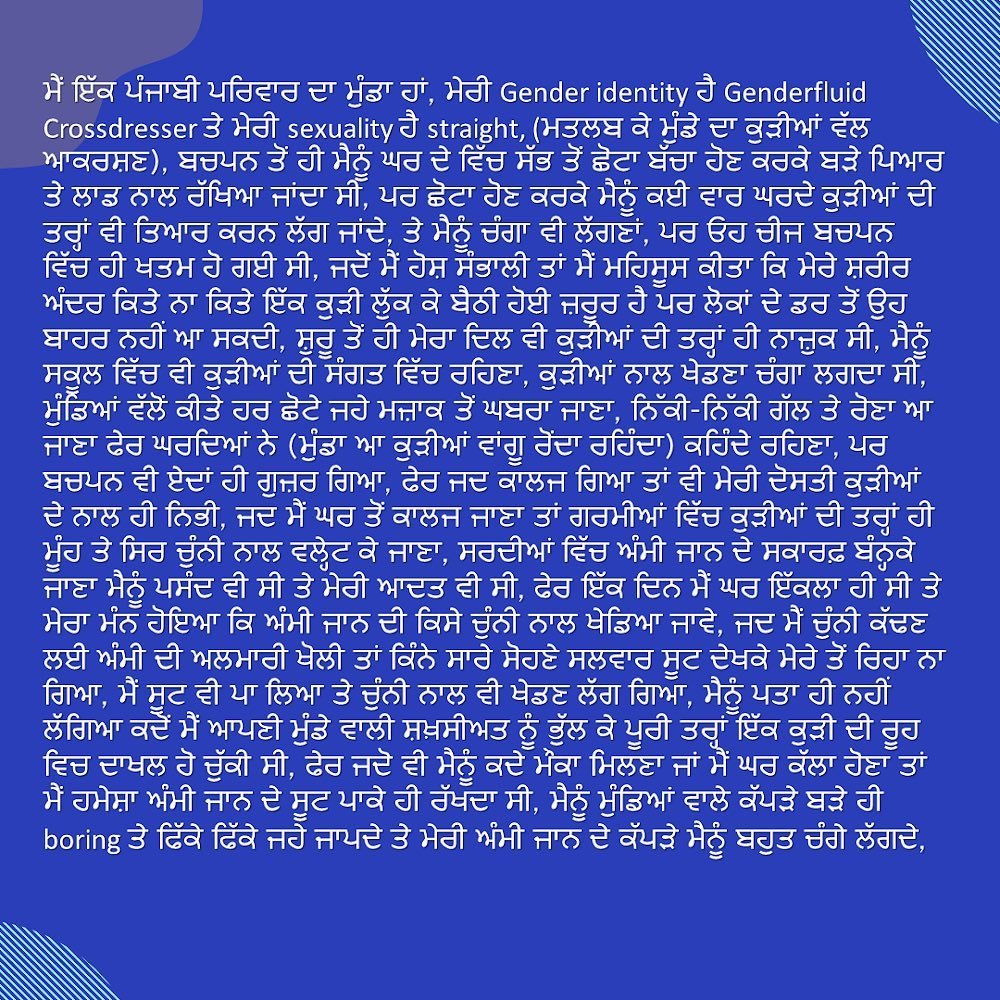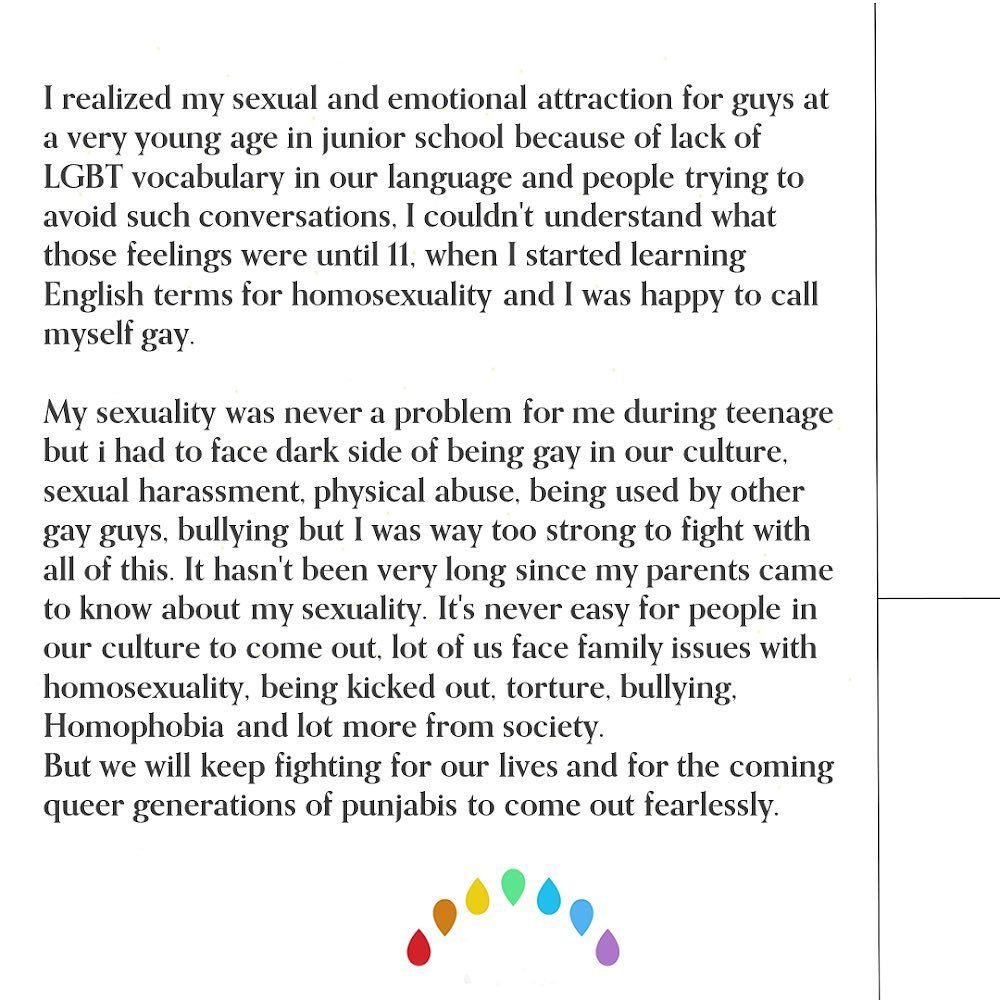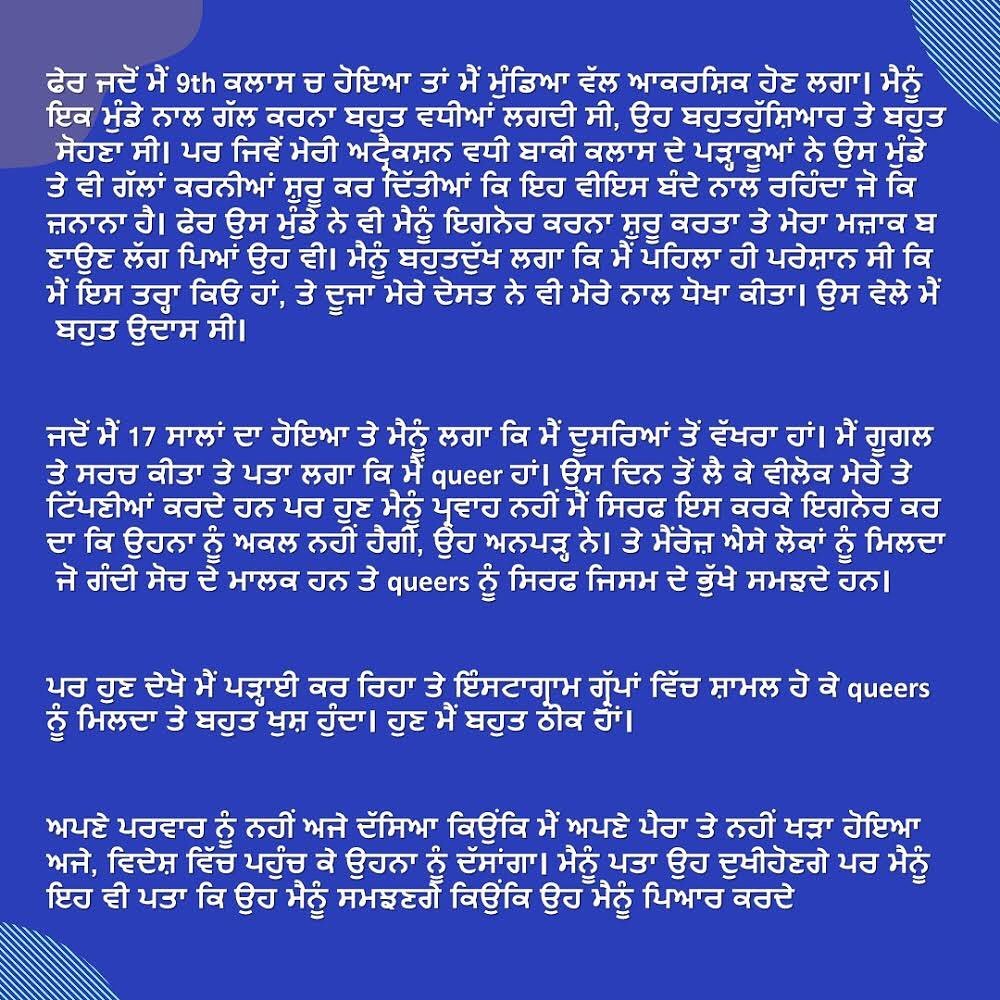 Through testimonials and 2 live video interviews, he had 1,148 followers and followed 110 accounts. The stories submitted to him typically shared what it felt like to be LGBT/Queer and Punjabi. The stories range in confidentiality (from individuals sharing their full identity to being entirely anonymous), in topic (e.g., joy, harm, sexual violence, communal uplift, general posts of uplift and history), length (1-4 posts in slidedeck), identity within Punjab (e.g., faith, location, age), and geography (e.g., based in Punjab now, born in Punjab). In their posts, Queer Punjab also wrote captions, which were all almost exclusively “Queer Punjab Story X @handle If you would like to contribute your story please dm this page. ਜੇ ਤੁਸੀਂ ਅਪਣੀ ਕਹਾਣੀ ਸ਼ੇ ਅਰ ਕਰਨੀ ਚਾਹੁੰਦੇ ਹੋ ਤਾਂ dm ਕਰੋ ਜੀ। We must record our struggles & emotions #QueerPunjab #LGBTPunjab”.