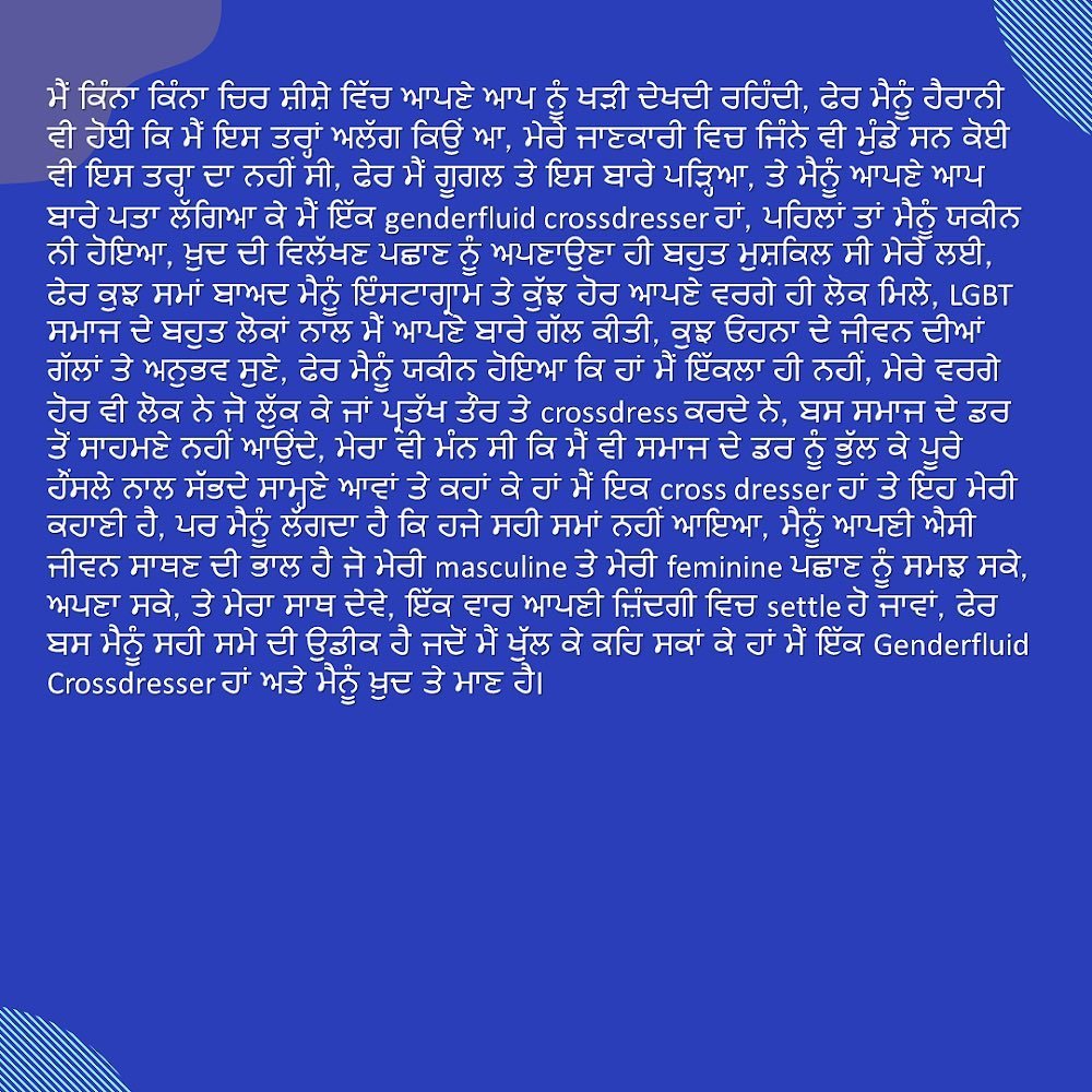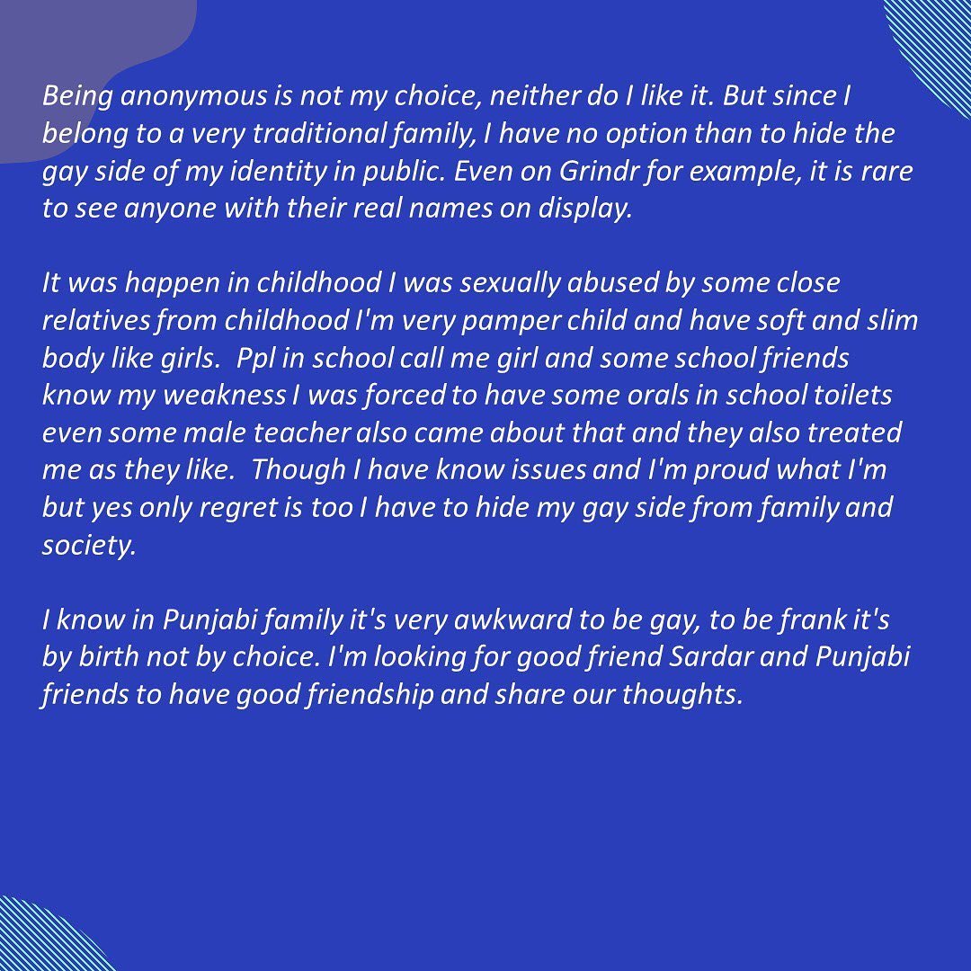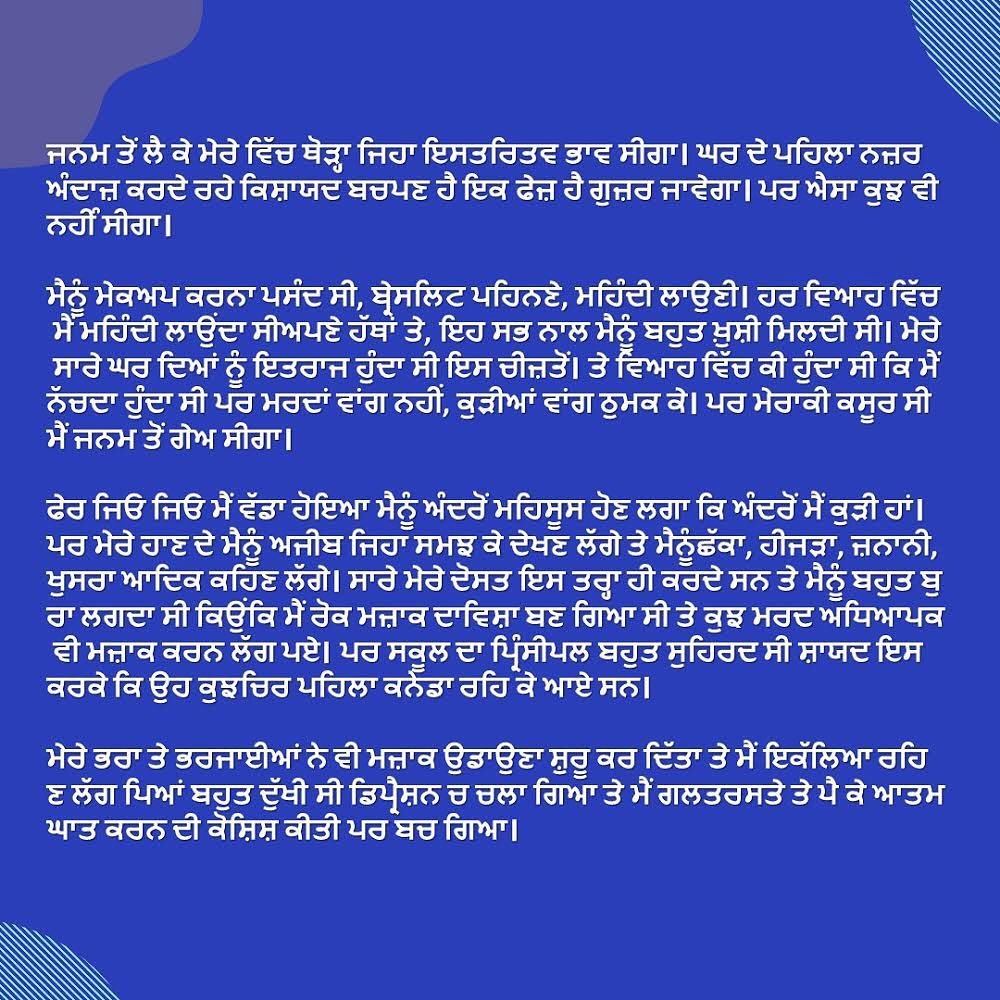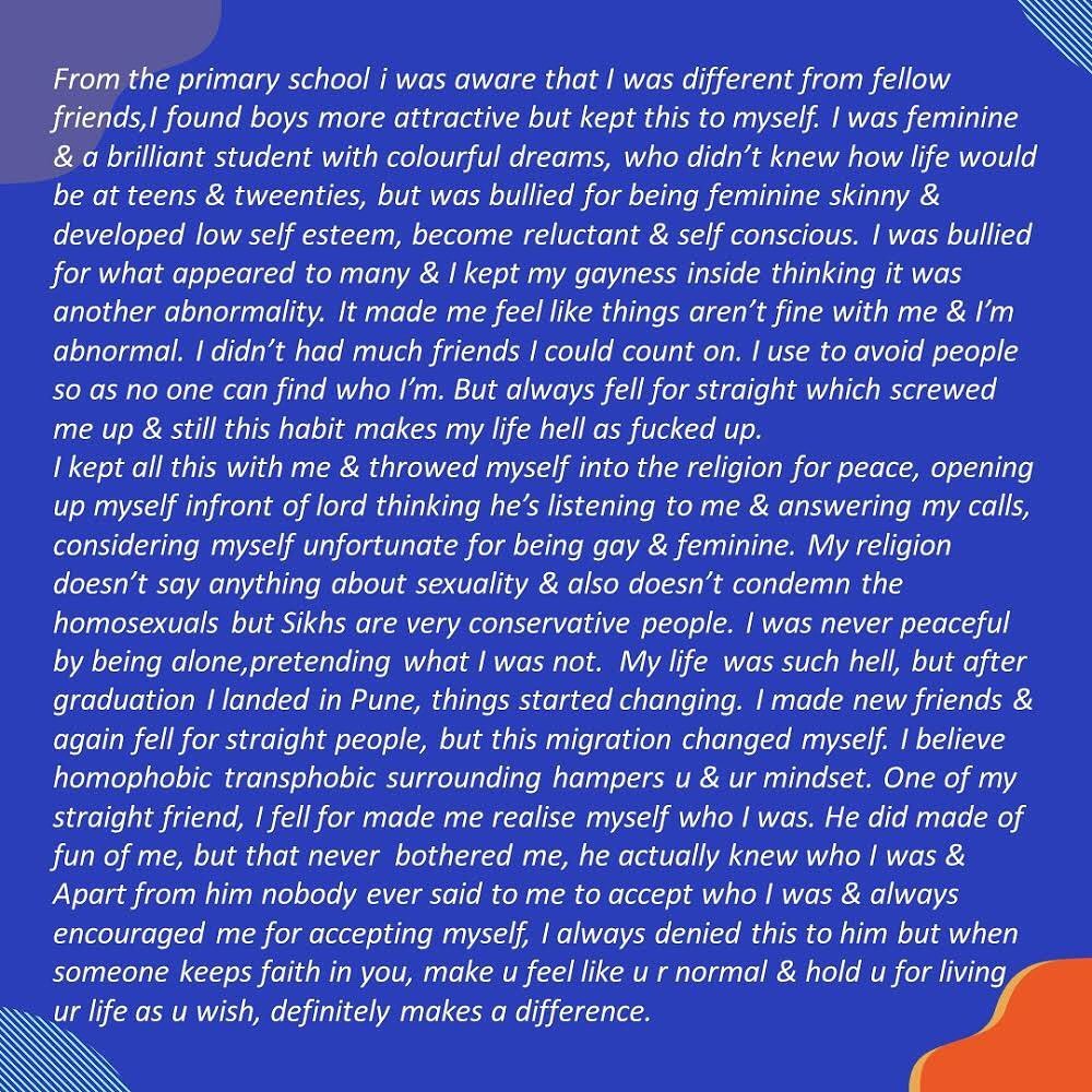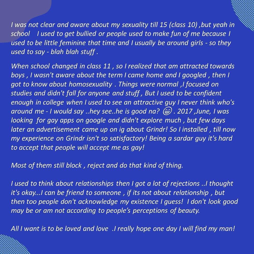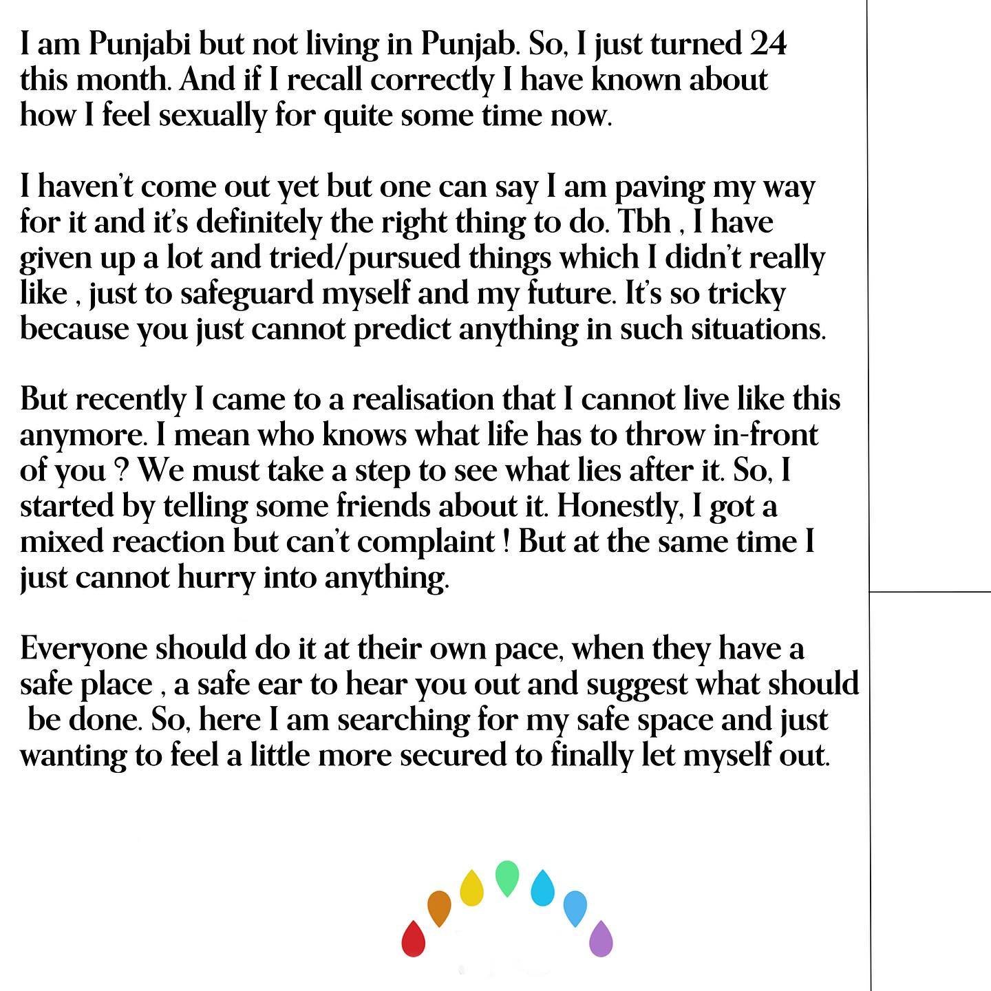 Through testimonials and 2 live video interviews, he had 1,148 followers and followed 110 accounts. The stories submitted to him typically shared what it felt like to be LGBT/Queer and Punjabi. The stories range in confidentiality (from individuals sharing their full identity to being entirely anonymous), in topic (e.g., joy, harm, sexual violence, communal uplift, general posts of uplift and history), length (1-4 posts in slidedeck), identity within Punjab (e.g., faith, location, age), and geography (e.g., based in Punjab now, born in Punjab). In their posts, Queer Punjab also wrote captions, which were all almost exclusively “Queer Punjab Story X @handle If you would like to contribute your story please dm this page. ਜੇ ਤੁਸੀਂ ਅਪਣੀ ਕਹਾਣੀ ਸ਼ੇ ਅਰ ਕਰਨੀ ਚਾਹੁੰਦੇ ਹੋ ਤਾਂ dm ਕਰੋ ਜੀ। We must record our struggles & emotions #QueerPunjab #LGBTPunjab”.
