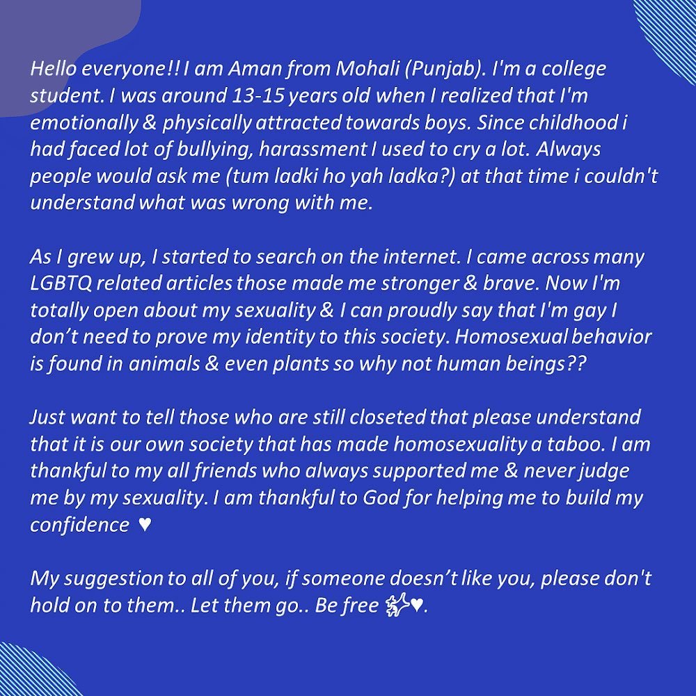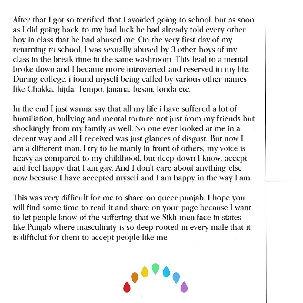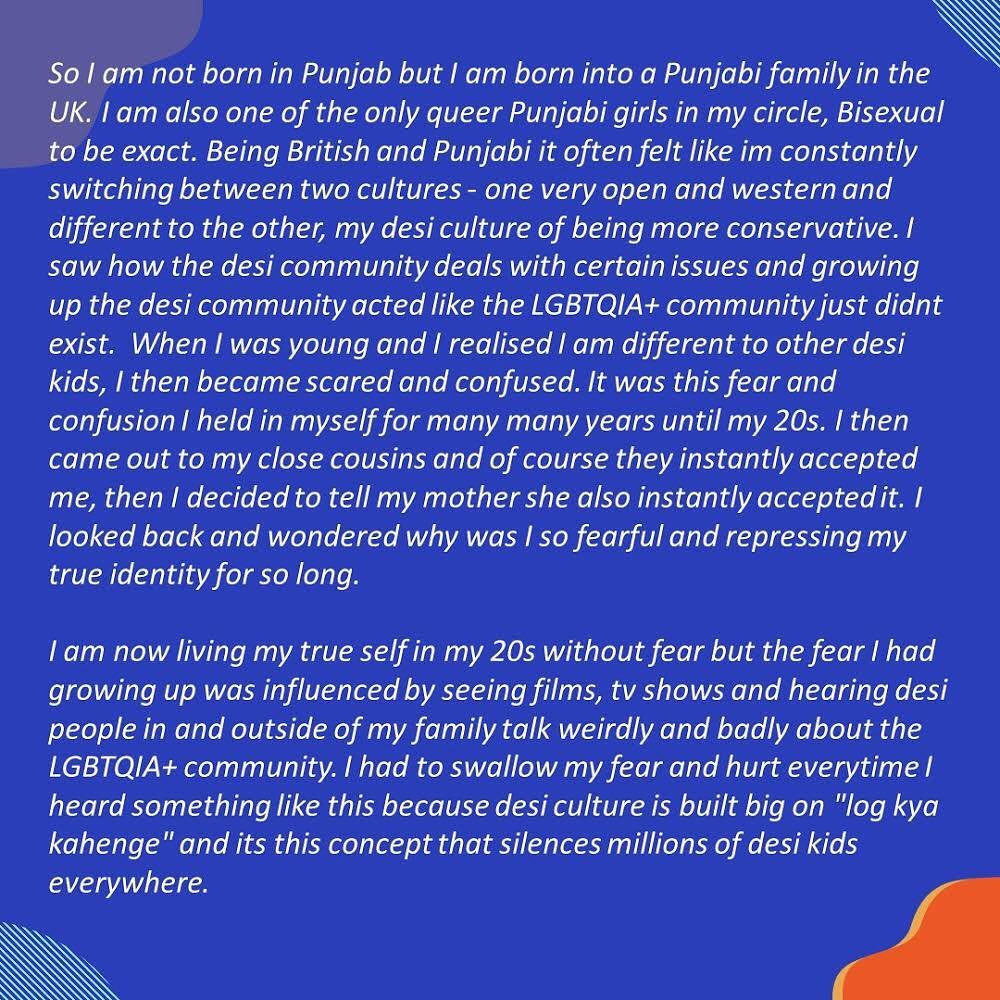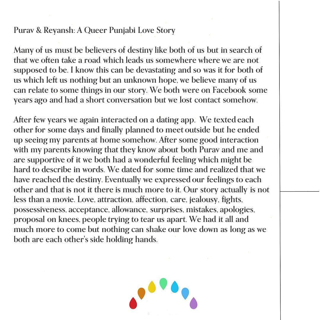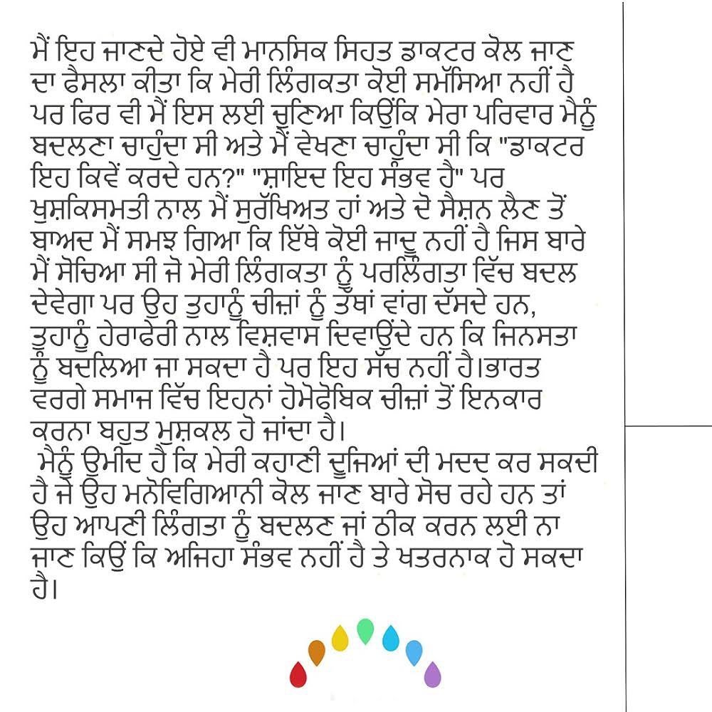 Through testimonials and 2 live video interviews, he had 1,148 followers and followed 110 accounts. The stories submitted to him typically shared what it felt like to be LGBT/Queer and Punjabi. The stories range in confidentiality (from individuals sharing their full identity to being entirely anonymous), in topic (e.g., joy, harm, sexual violence, communal uplift, general posts of uplift and history), length (1-4 posts in slidedeck), identity within Punjab (e.g., faith, location, age), and geography (e.g., based in Punjab now, born in Punjab). In their posts, Queer Punjab also wrote captions, which were all almost exclusively “Queer Punjab Story X @handle If you would like to contribute your story please dm this page. ਜੇ ਤੁਸੀਂ ਅਪਣੀ ਕਹਾਣੀ ਸ਼ੇ ਅਰ ਕਰਨੀ ਚਾਹੁੰਦੇ ਹੋ ਤਾਂ dm ਕਰੋ ਜੀ। We must record our struggles & emotions #QueerPunjab #LGBTPunjab”.