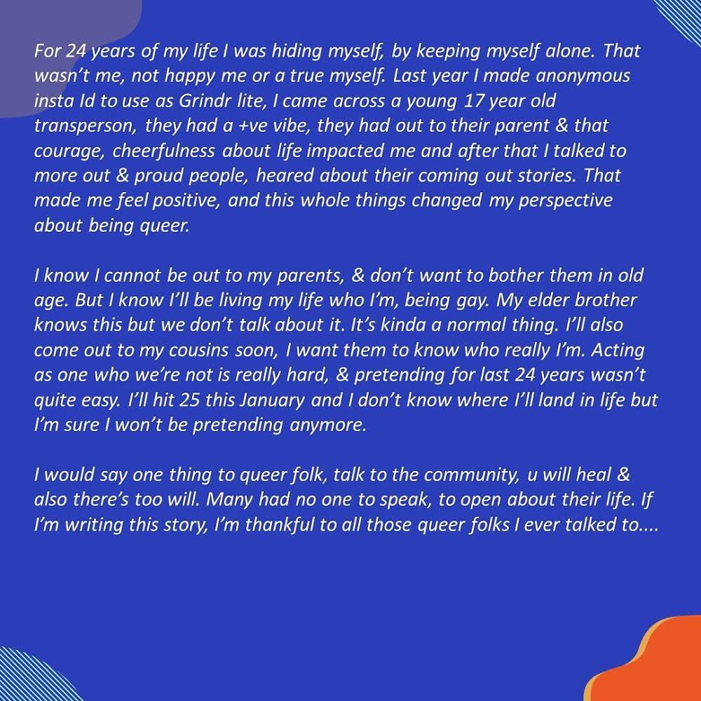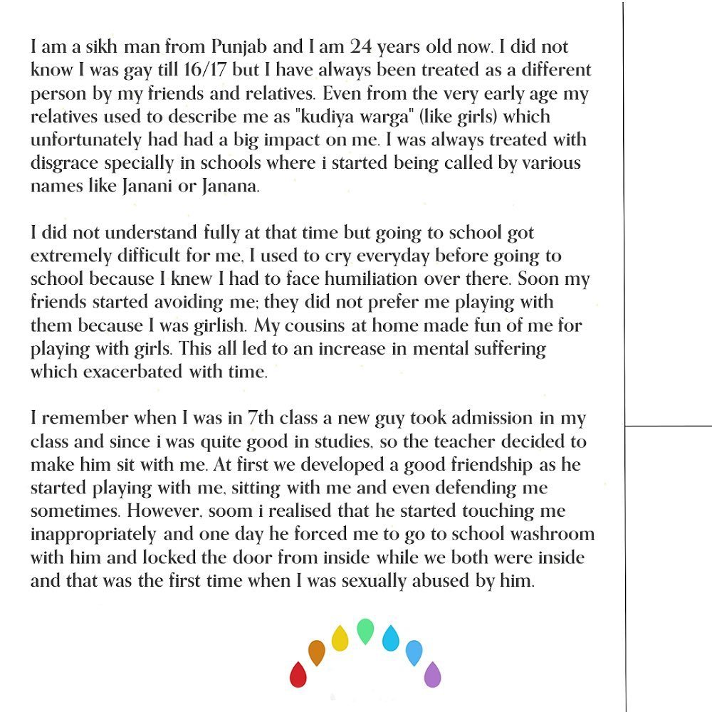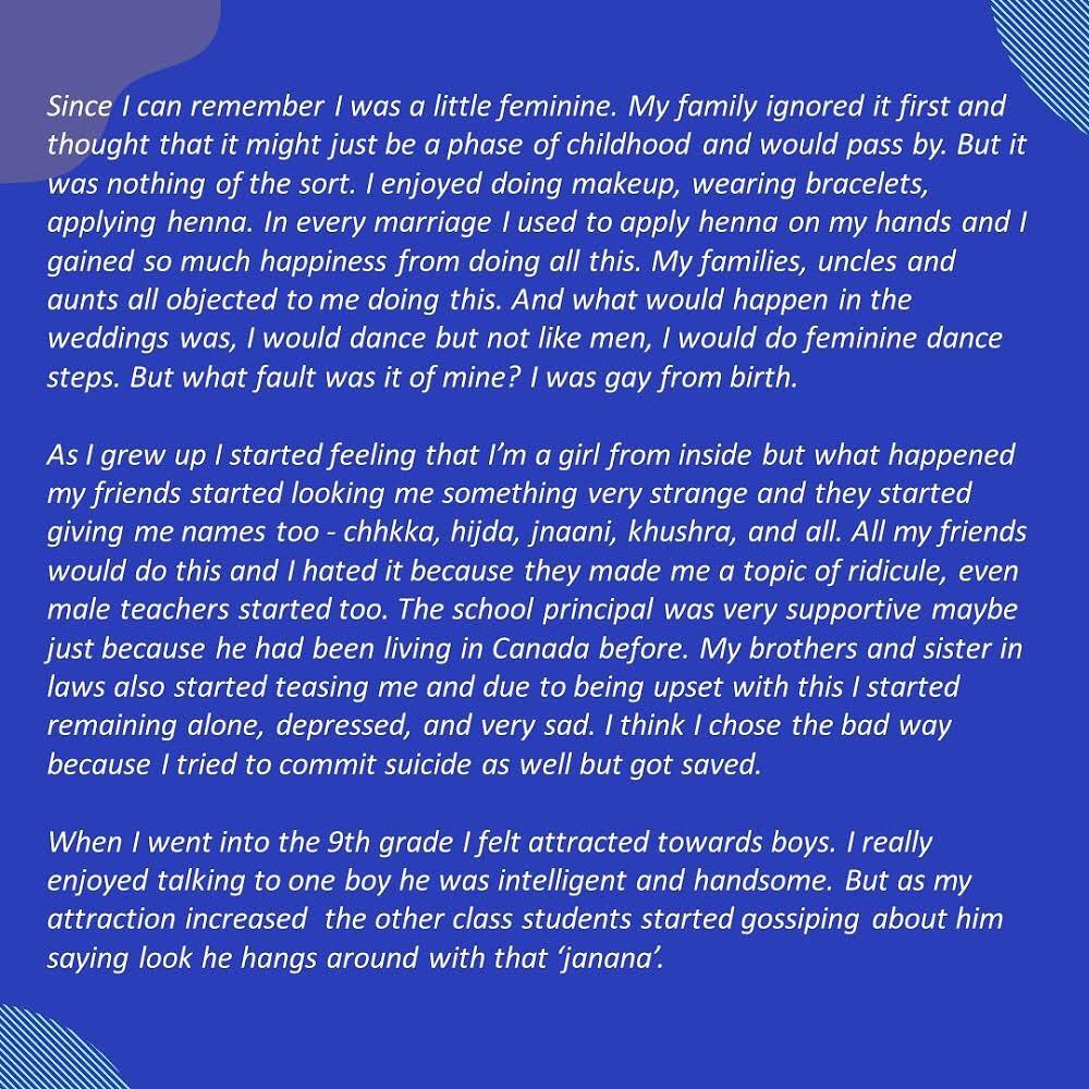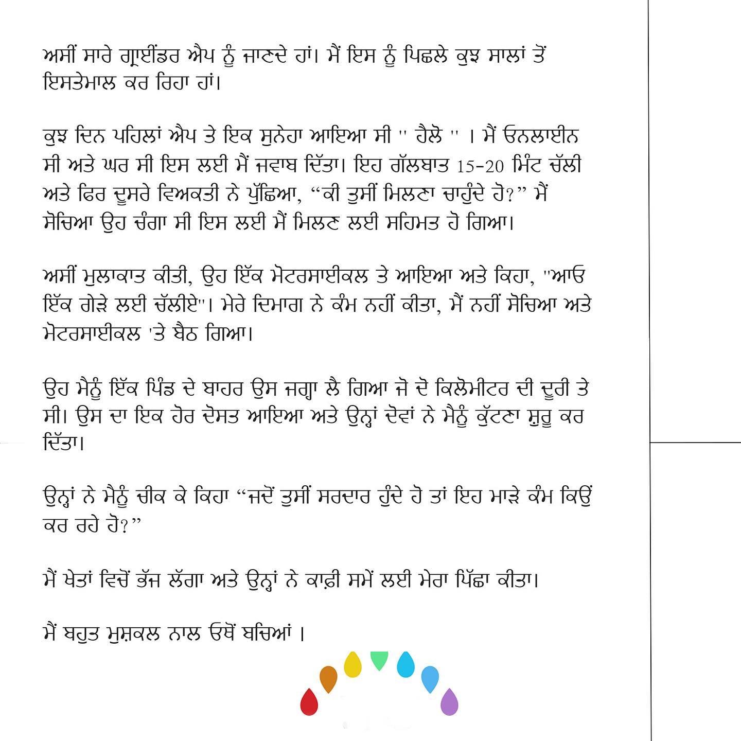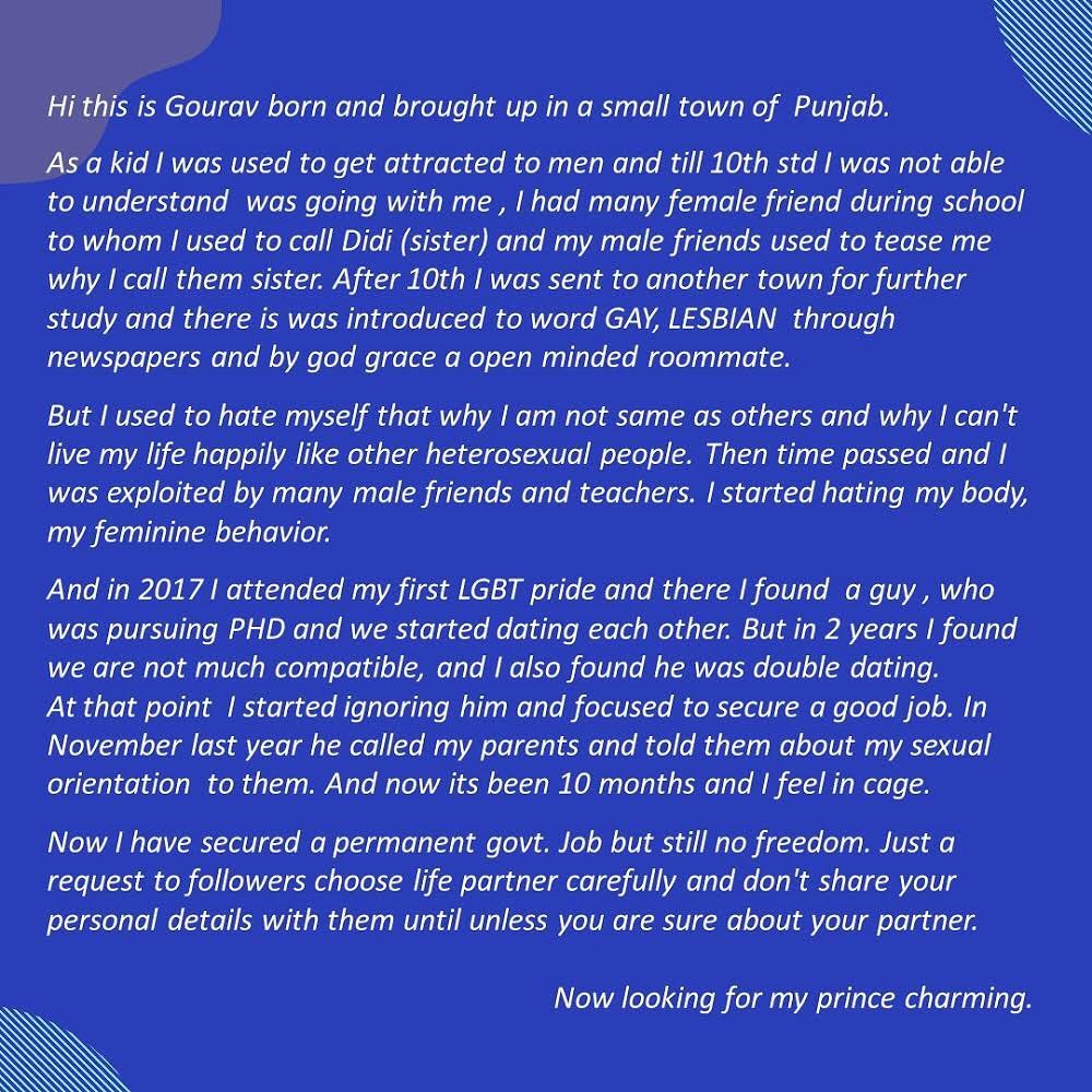 Through testimonials and 2 live video interviews, he had 1,148 followers and followed 110 accounts. The stories submitted to him typically shared what it felt like to be LGBT/Queer and Punjabi. The stories range in confidentiality (from individuals sharing their full identity to being entirely anonymous), in topic (e.g., joy, harm, sexual violence, communal uplift, general posts of uplift and history), length (1-4 posts in slidedeck), identity within Punjab (e.g., faith, location, age), and geography (e.g., based in Punjab now, born in Punjab). In their posts, Queer Punjab also wrote captions, which were all almost exclusively “Queer Punjab Story X @handle If you would like to contribute your story please dm this page. ਜੇ ਤੁਸੀਂ ਅਪਣੀ ਕਹਾਣੀ ਸ਼ੇ ਅਰ ਕਰਨੀ ਚਾਹੁੰਦੇ ਹੋ ਤਾਂ dm ਕਰੋ ਜੀ। We must record our struggles & emotions #QueerPunjab #LGBTPunjab”.