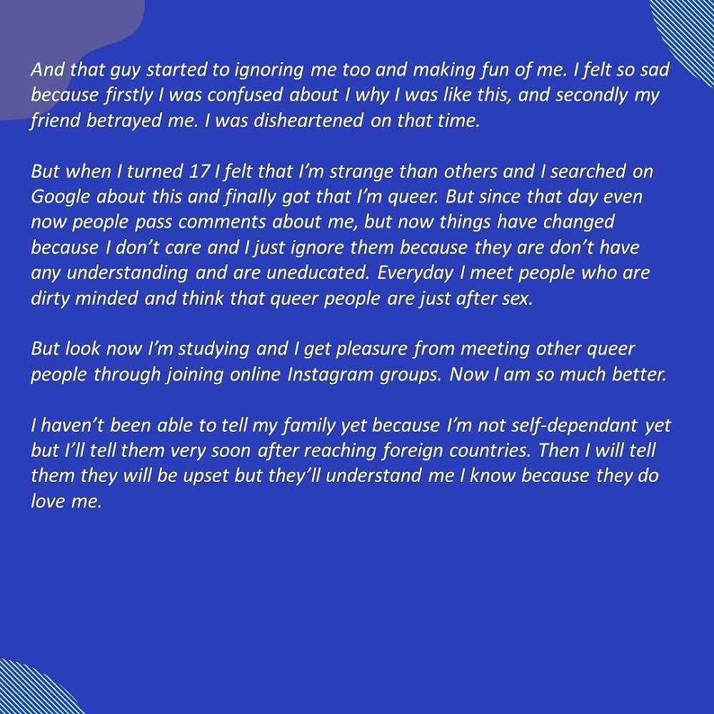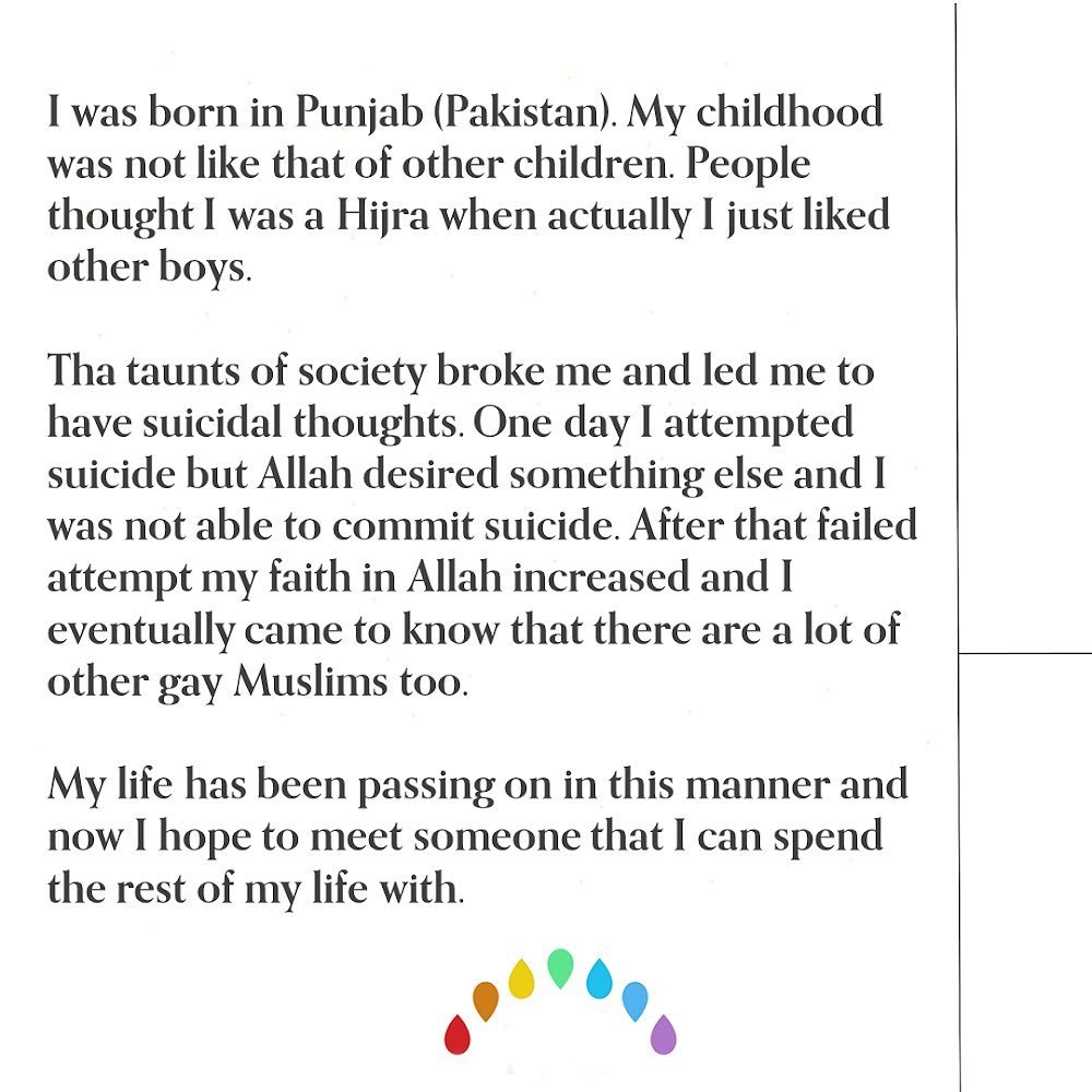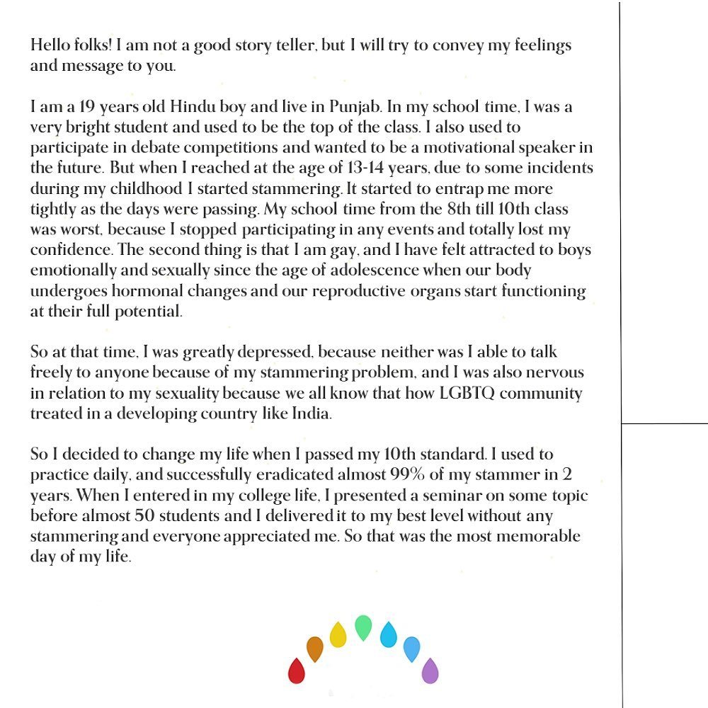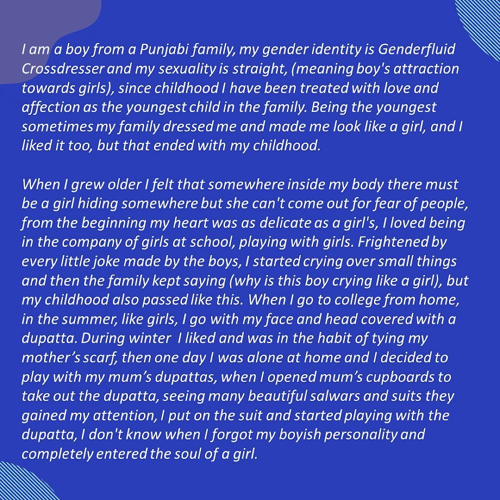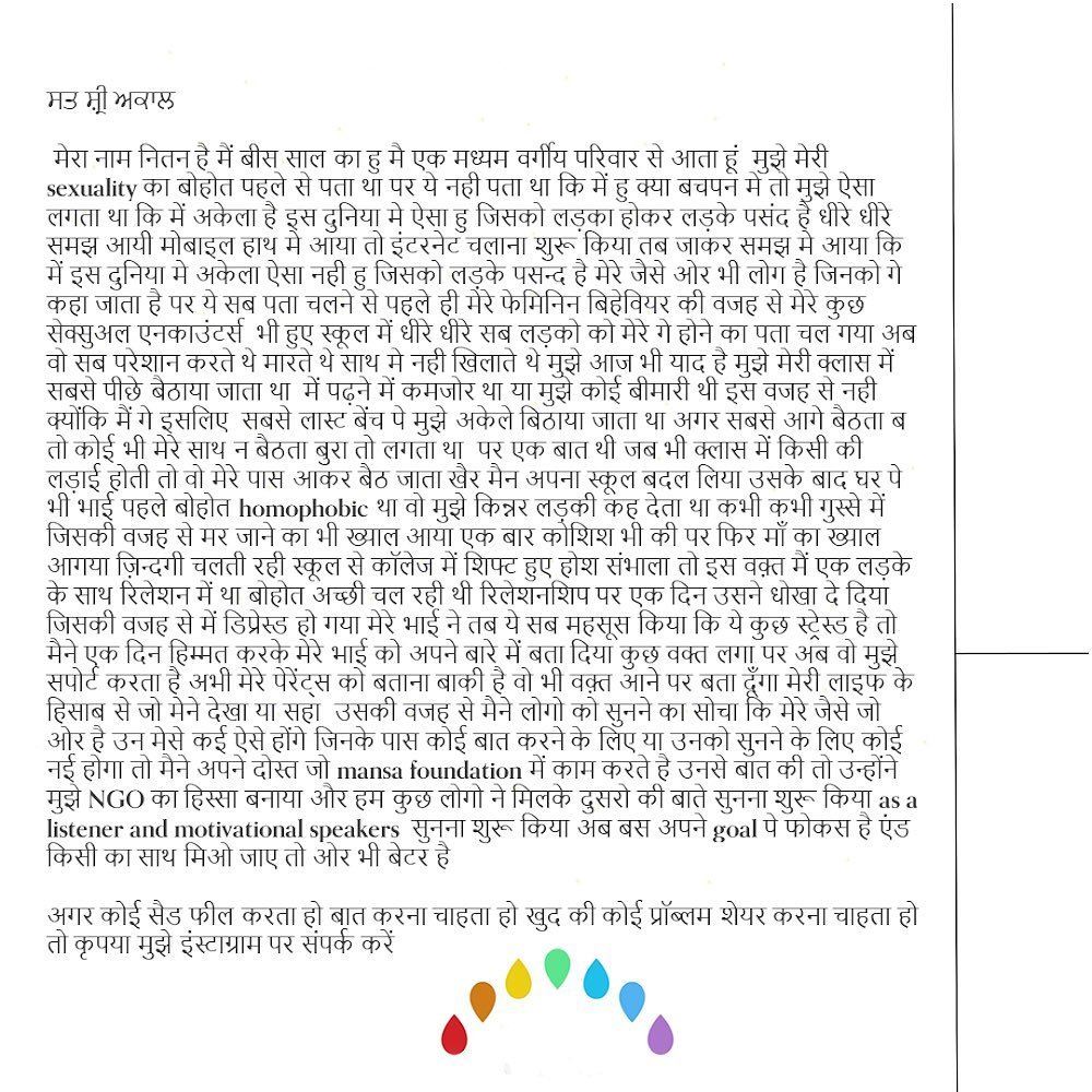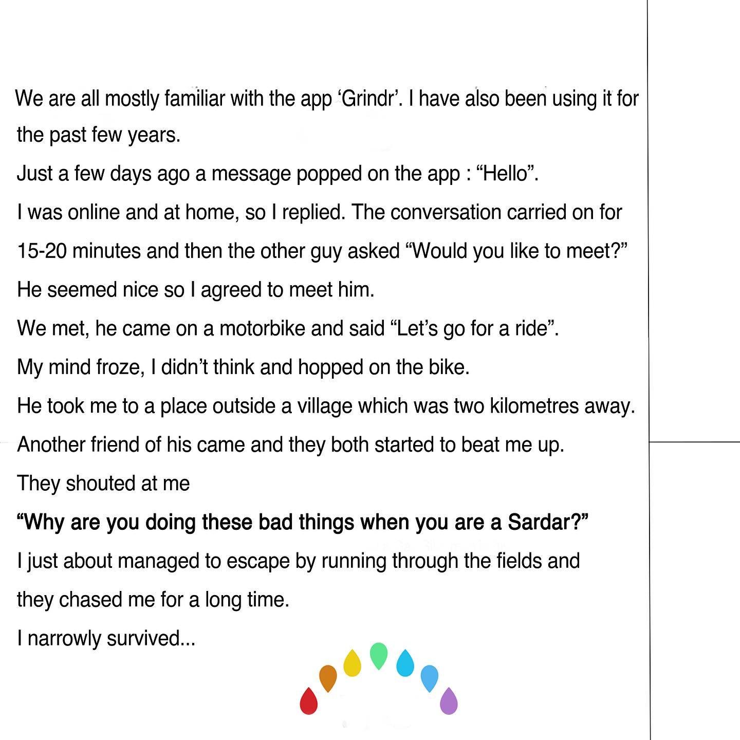 Through testimonials and 2 live video interviews, he had 1,148 followers and followed 110 accounts. The stories submitted to him typically shared what it felt like to be LGBT/Queer and Punjabi. The stories range in confidentiality (from individuals sharing their full identity to being entirely anonymous), in topic (e.g., joy, harm, sexual violence, communal uplift, general posts of uplift and history), length (1-4 posts in slidedeck), identity within Punjab (e.g., faith, location, age), and geography (e.g., based in Punjab now, born in Punjab). In their posts, Queer Punjab also wrote captions, which were all almost exclusively “Queer Punjab Story X @handle If you would like to contribute your story please dm this page. ਜੇ ਤੁਸੀਂ ਅਪਣੀ ਕਹਾਣੀ ਸ਼ੇ ਅਰ ਕਰਨੀ ਚਾਹੁੰਦੇ ਹੋ ਤਾਂ dm ਕਰੋ ਜੀ। We must record our struggles & emotions #QueerPunjab #LGBTPunjab”.