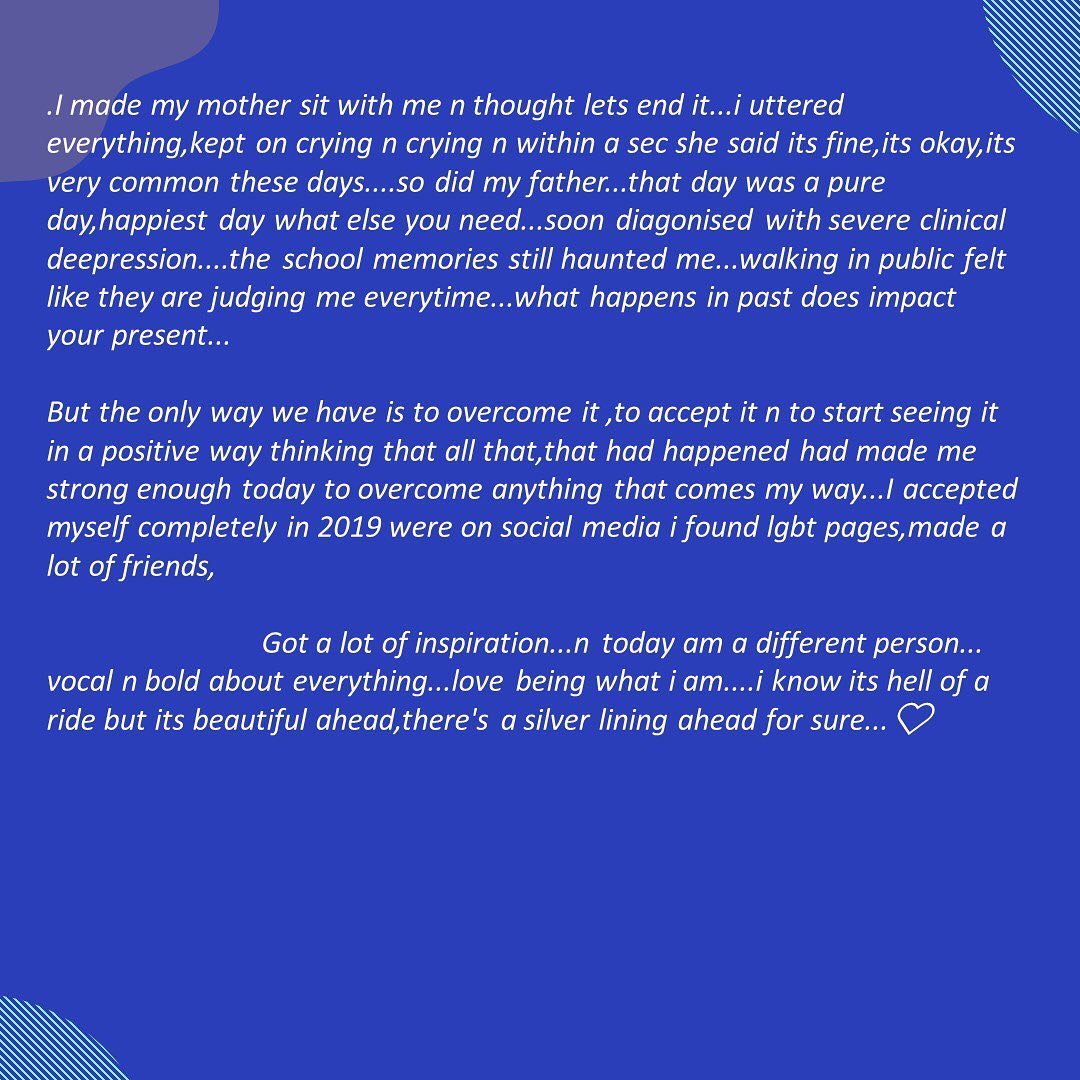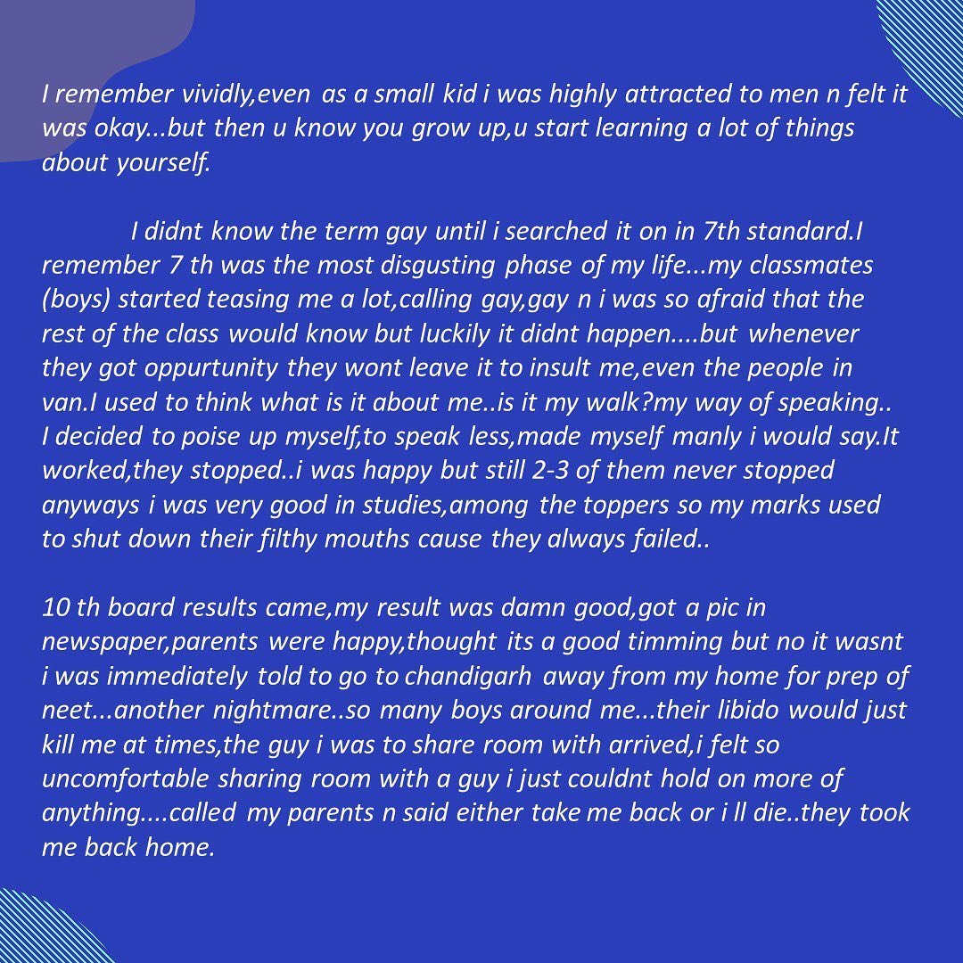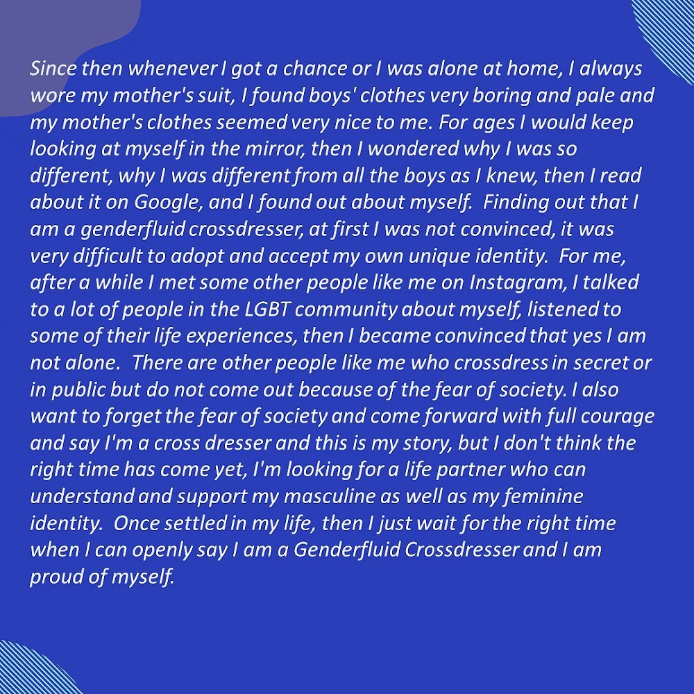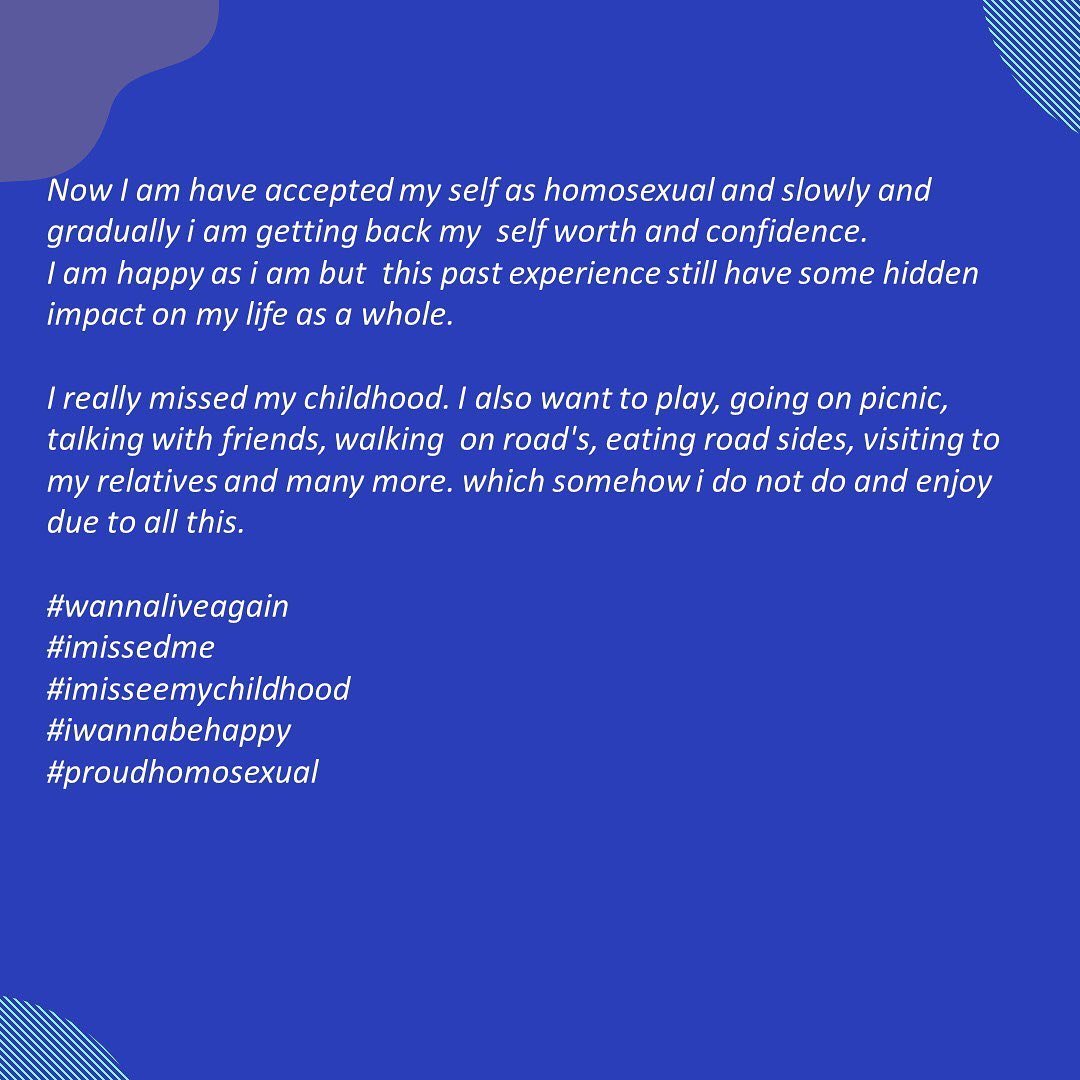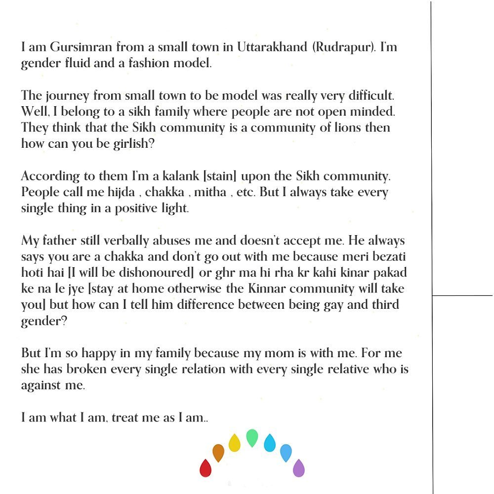 Through testimonials and 2 live video interviews, he had 1,148 followers and followed 110 accounts. The stories submitted to him typically shared what it felt like to be LGBT/Queer and Punjabi. The stories range in confidentiality (from individuals sharing their full identity to being entirely anonymous), in topic (e.g., joy, harm, sexual violence, communal uplift, general posts of uplift and history), length (1-4 posts in slidedeck), identity within Punjab (e.g., faith, location, age), and geography (e.g., based in Punjab now, born in Punjab). In their posts, Queer Punjab also wrote captions, which were all almost exclusively “Queer Punjab Story X @handle If you would like to contribute your story please dm this page. ਜੇ ਤੁਸੀਂ ਅਪਣੀ ਕਹਾਣੀ ਸ਼ੇ ਅਰ ਕਰਨੀ ਚਾਹੁੰਦੇ ਹੋ ਤਾਂ dm ਕਰੋ ਜੀ। We must record our struggles & emotions #QueerPunjab #LGBTPunjab”.