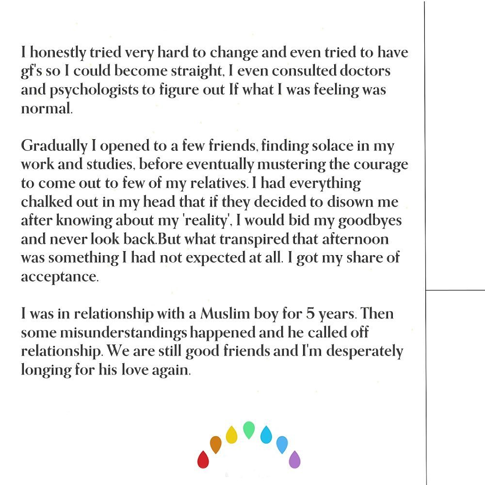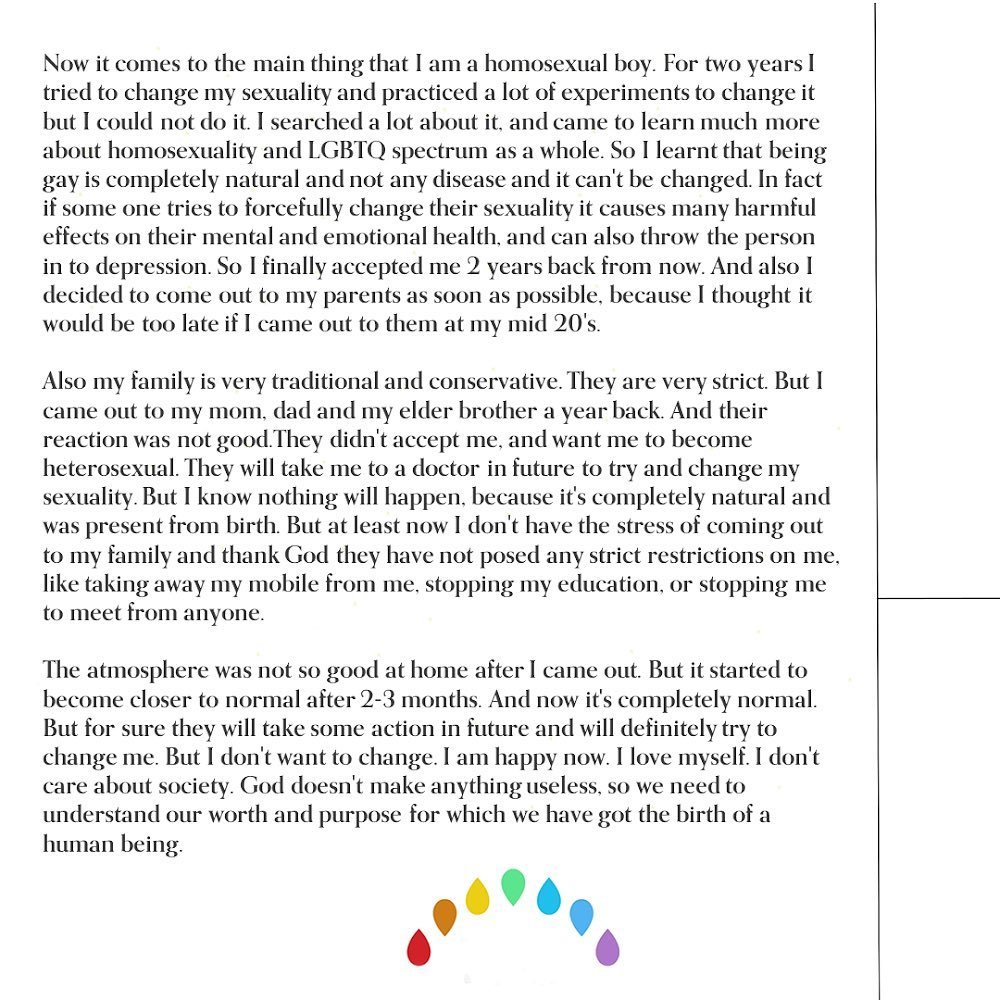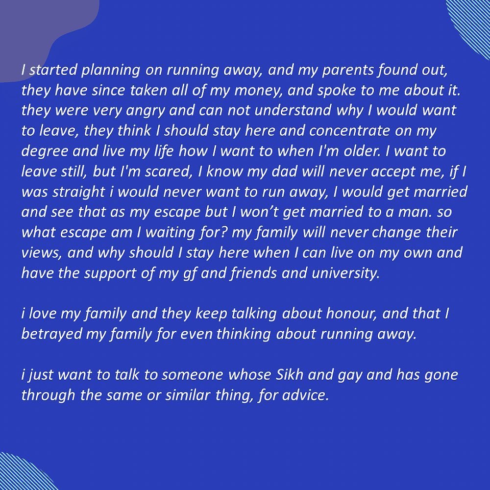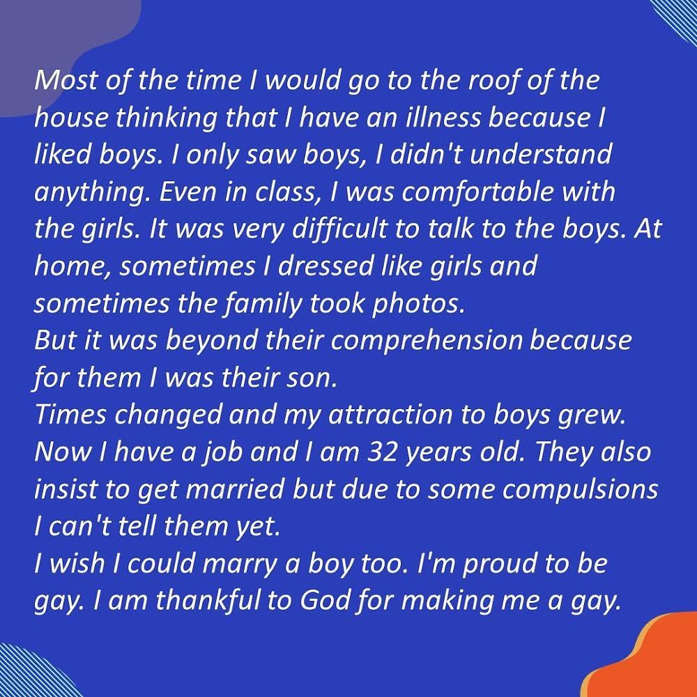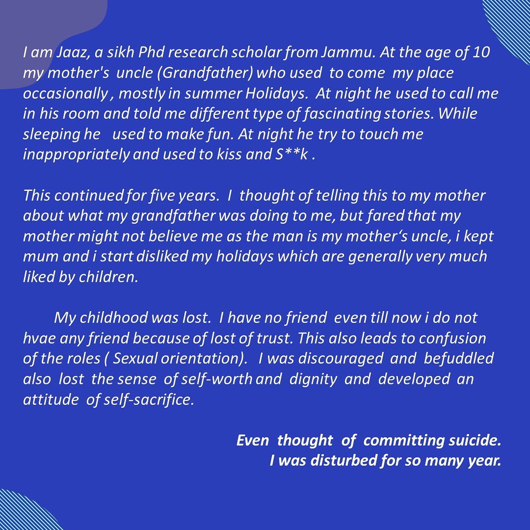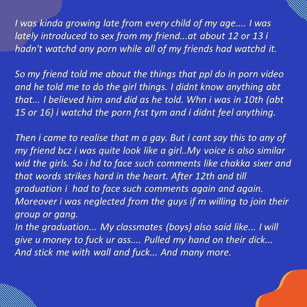 Through testimonials and 2 live video interviews, he had 1,148 followers and followed 110 accounts. The stories submitted to him typically shared what it felt like to be LGBT/Queer and Punjabi. The stories range in confidentiality (from individuals sharing their full identity to being entirely anonymous), in topic (e.g., joy, harm, sexual violence, communal uplift, general posts of uplift and history), length (1-4 posts in slidedeck), identity within Punjab (e.g., faith, location, age), and geography (e.g., based in Punjab now, born in Punjab). In their posts, Queer Punjab also wrote captions, which were all almost exclusively “Queer Punjab Story X @handle If you would like to contribute your story please dm this page. ਜੇ ਤੁਸੀਂ ਅਪਣੀ ਕਹਾਣੀ ਸ਼ੇ ਅਰ ਕਰਨੀ ਚਾਹੁੰਦੇ ਹੋ ਤਾਂ dm ਕਰੋ ਜੀ। We must record our struggles & emotions #QueerPunjab #LGBTPunjab”.