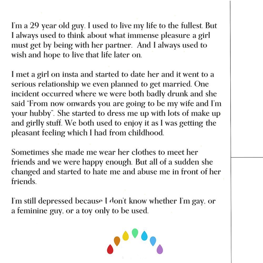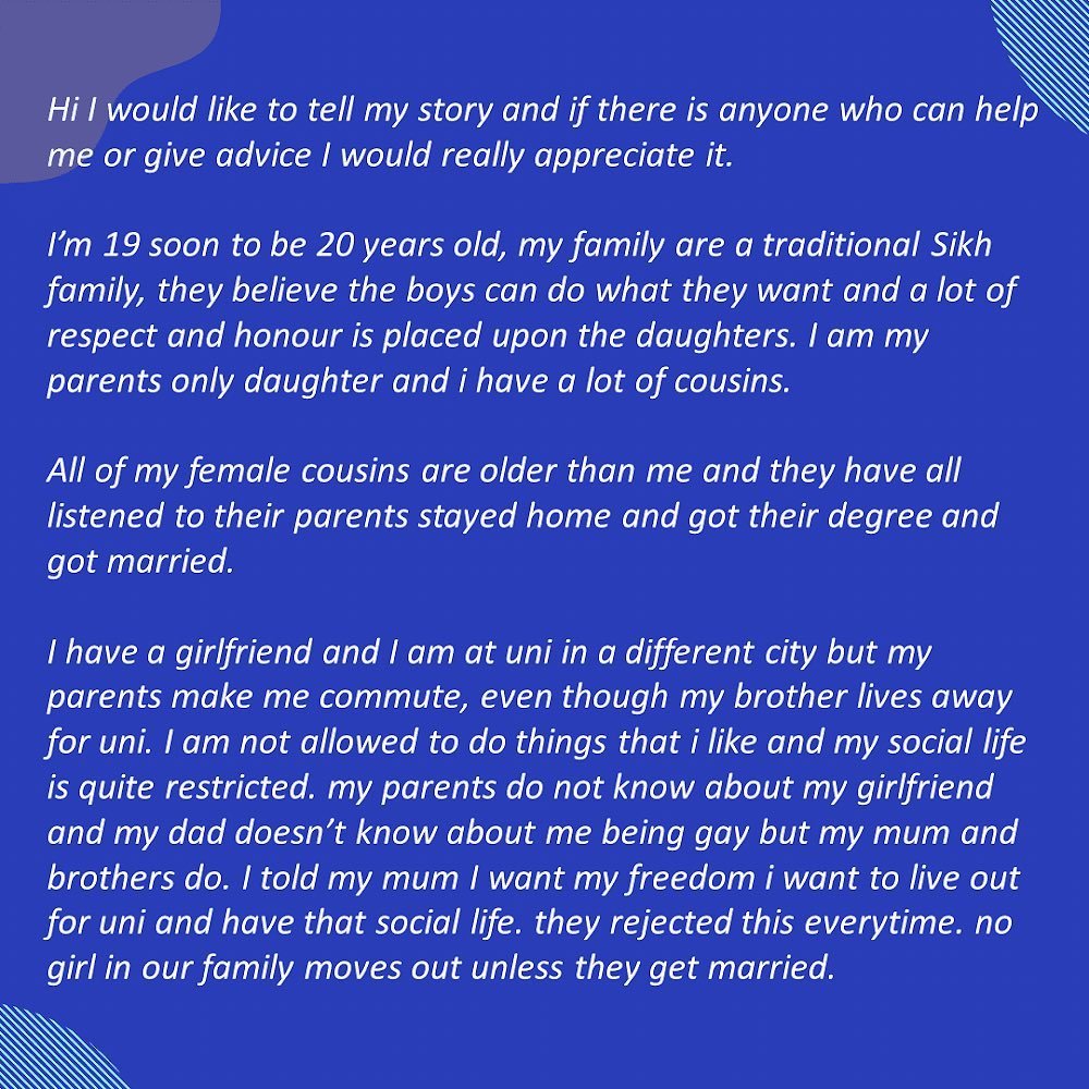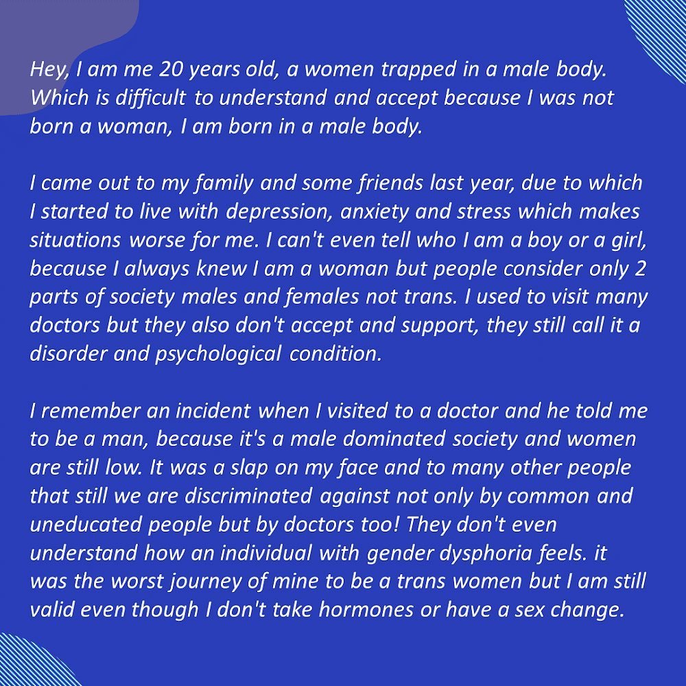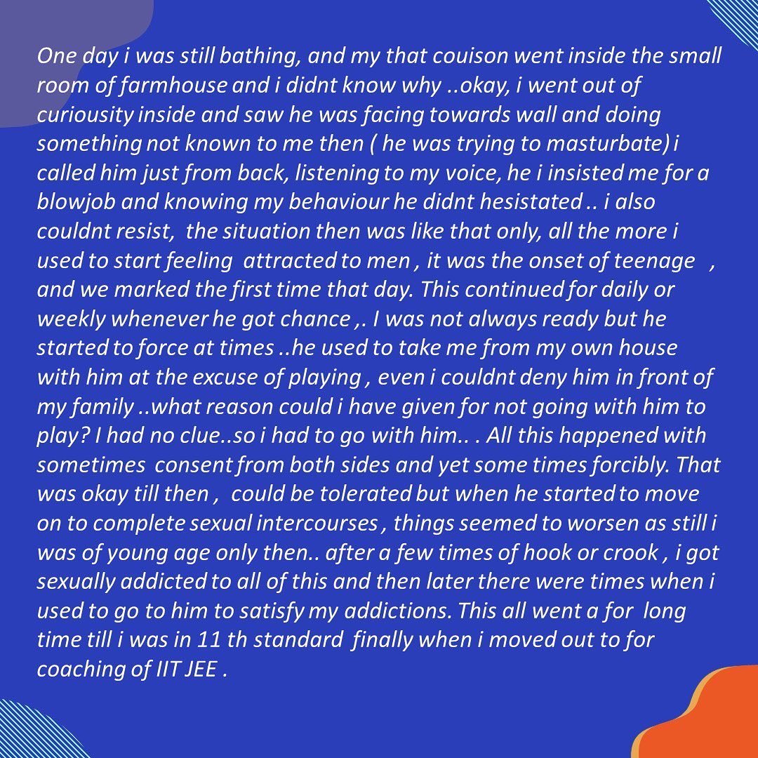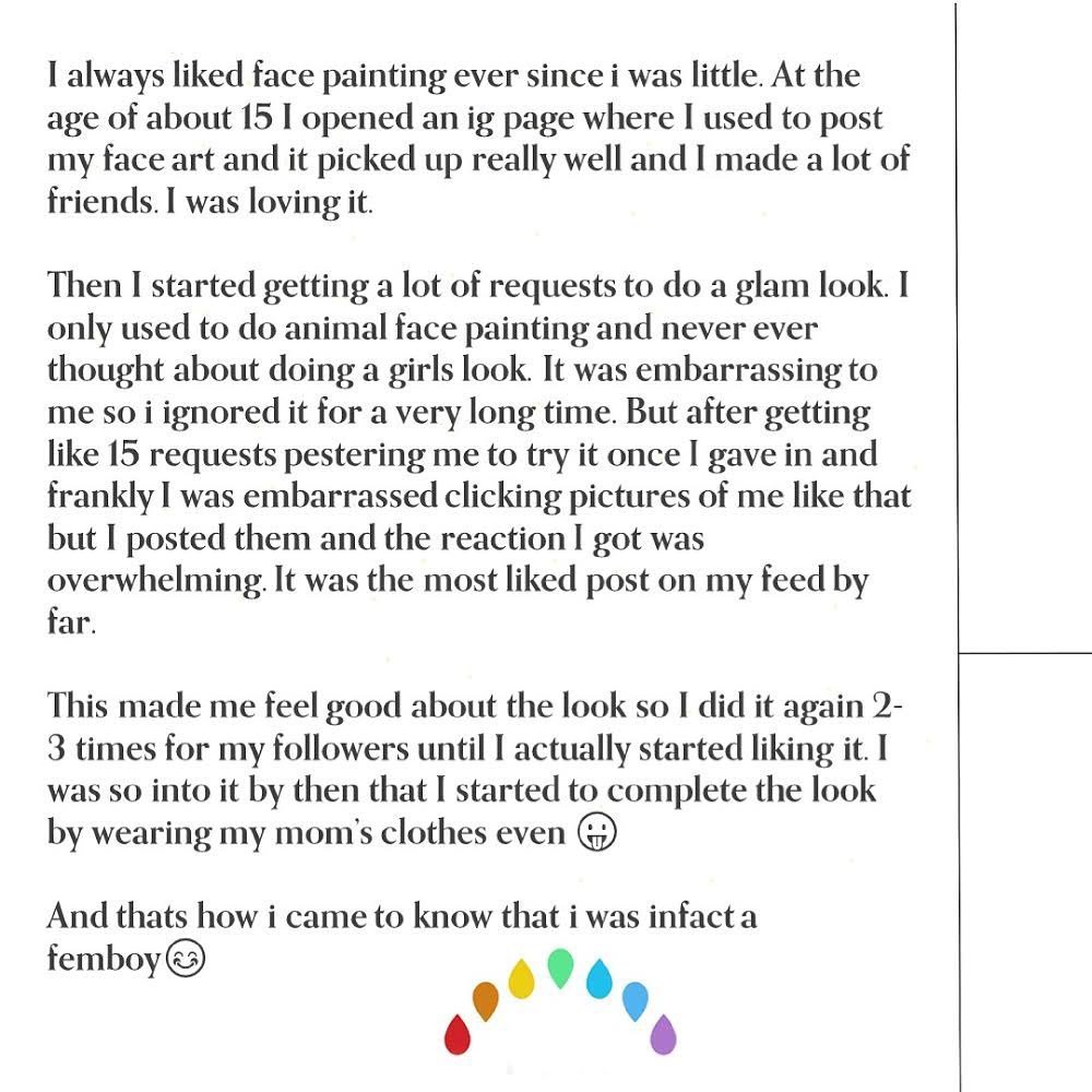 Through testimonials and 2 live video interviews, he had 1,148 followers and followed 110 accounts. The stories submitted to him typically shared what it felt like to be LGBT/Queer and Punjabi. The stories range in confidentiality (from individuals sharing their full identity to being entirely anonymous), in topic (e.g., joy, harm, sexual violence, communal uplift, general posts of uplift and history), length (1-4 posts in slidedeck), identity within Punjab (e.g., faith, location, age), and geography (e.g., based in Punjab now, born in Punjab). In their posts, Queer Punjab also wrote captions, which were all almost exclusively “Queer Punjab Story X @handle If you would like to contribute your story please dm this page. ਜੇ ਤੁਸੀਂ ਅਪਣੀ ਕਹਾਣੀ ਸ਼ੇ ਅਰ ਕਰਨੀ ਚਾਹੁੰਦੇ ਹੋ ਤਾਂ dm ਕਰੋ ਜੀ। We must record our struggles & emotions #QueerPunjab #LGBTPunjab”.