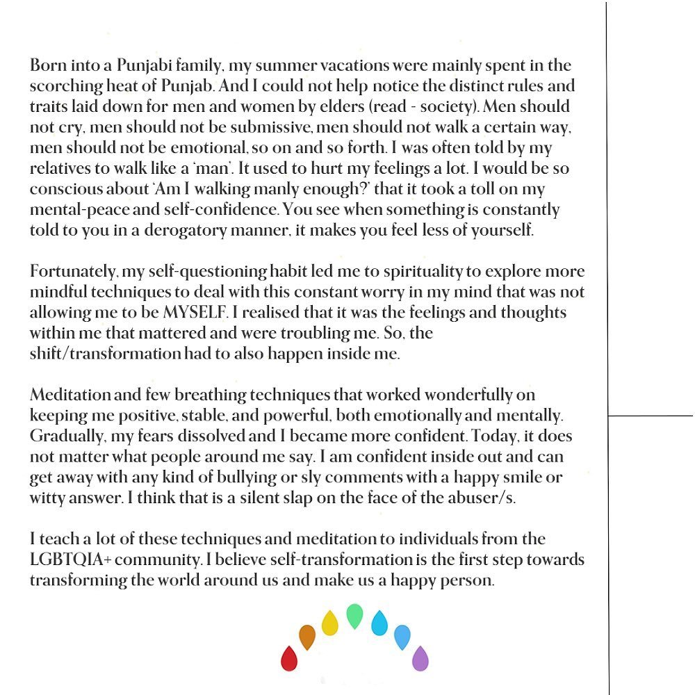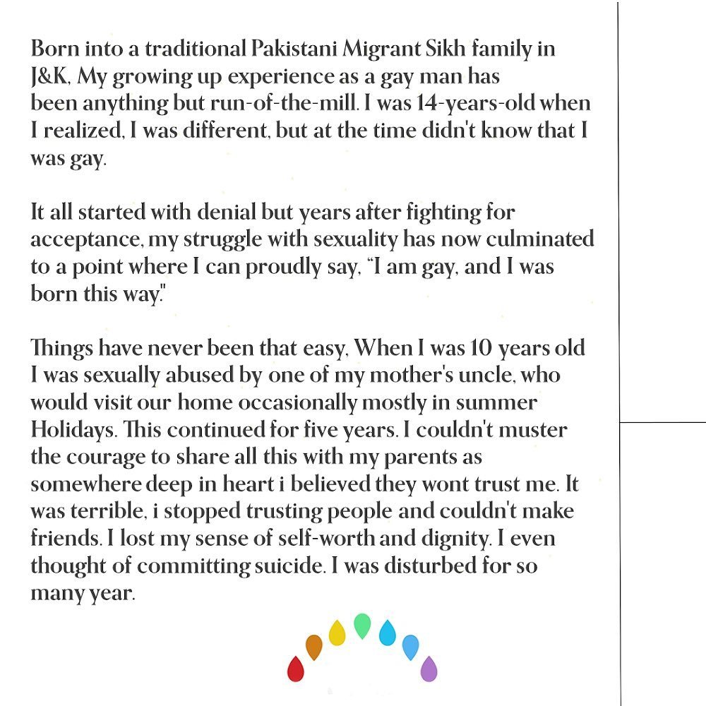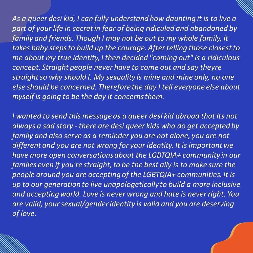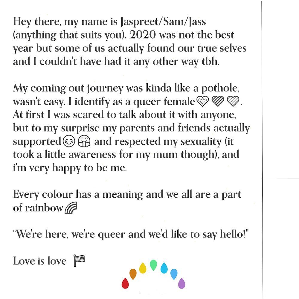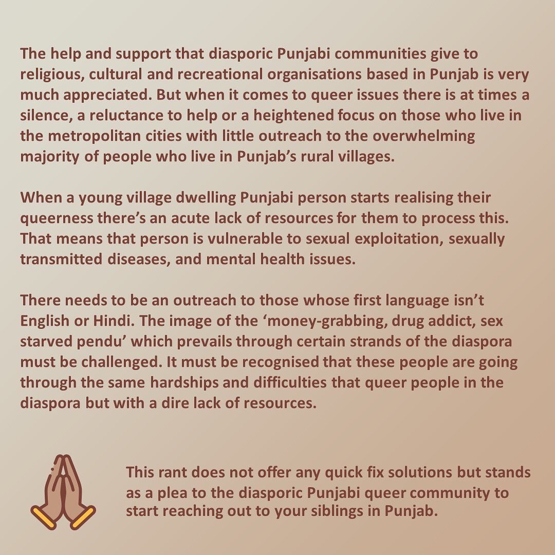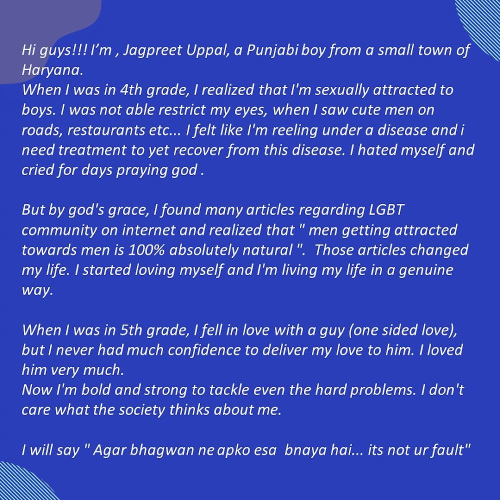 Between July 10, 2020 and September 19, 2021, @queerpunjab created and managed an Instagram page (https://www.instagram.com/queerpunjab/). Describing the profile/himself in the bio, he writes, “Queer Punjab he/him A safe platform for Lgbt/Queer Punjabis to share our stories & struggles 🏳️‍🌈”.
